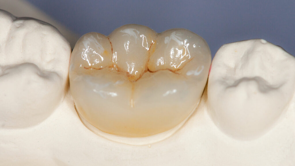 Eine aus einem Keramikblock gefräste Krone weist eine sehr Hohe Materialstabilität auf, da sie aus einem Vollmaterial besteht.