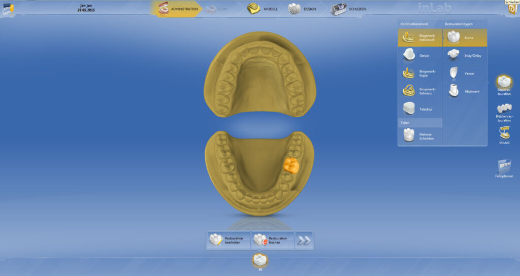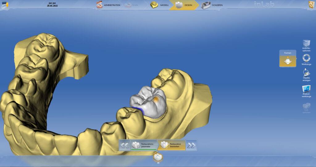 Mit Hilfe des vorhandenen Abdrucks, einer (virtuellen) Bissnahme (dreidimensionale Zuordnung der beiden Kiefer) und des Gegenkiefers, kann auch der Gegenkiefer virtuell eingeblendet werden. Dies entspricht der Artikulation von Biss und Gegenbiss im herkömmlichen Sinne. Somit kann nun eine passende Krone für Ihre Mundsituation virtuell konstruiert werden.