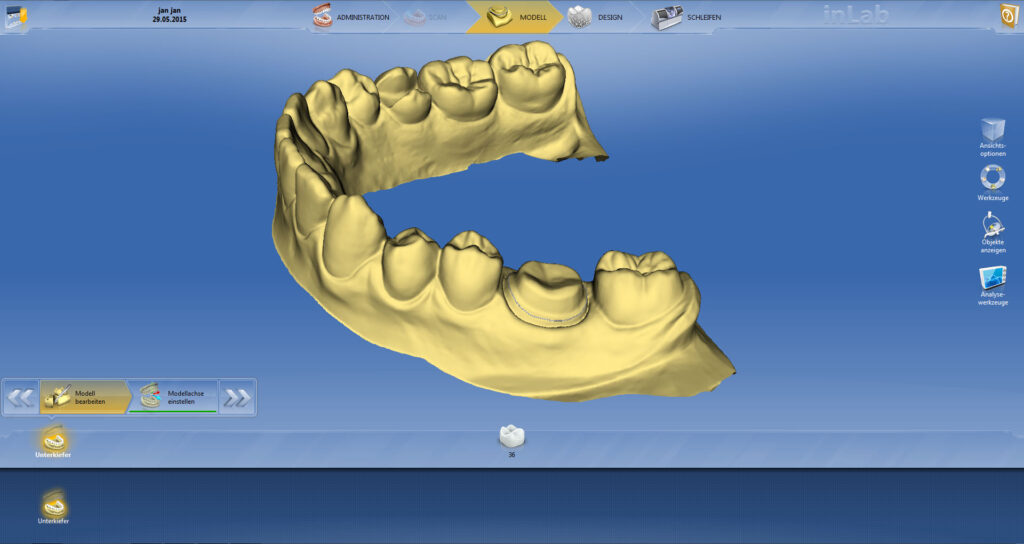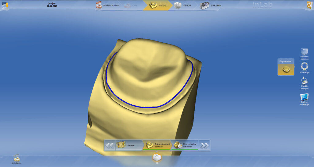 Wird auf Abdrücke verzichtet, kann auch direkt im Mund mit der intraoralen Kamera gescannt werden, so spart man sich einige Schritte, eventuelle Überführungsungenauigkeiten und Patienten, die z. B. an Würgereiz leiden sparen sich Abdrucklöffel und Abdruckmasse im Mund ertragen zu müssen. Nach dem Scannen durch einen digitalen, dreiachsigen 3D-Laserscanner werden die erhaltenen Daten in ein digitales 3-D-Modell gewandelt. Nun liegt die Mundsituation virtuell vor. Dieses Modell wird nun so getrimmt (beschnitten), dass der für die Krone vorbereitete Zahn isoliert vorliegt und man diesen von allen Seiten betrachten kann.