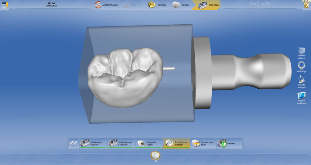 Nun wird der passende Keramikblock in der vorher bestimmten Zahnfarbe ausgewählt. Anschließend wird die Krone von der Fräsmaschine gefräst oder, je nach Anwendungsfall, geschliffen. Die Genauigkeit des fertigen Produktes beträgt dabei sogar +/- 25 μm.